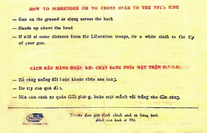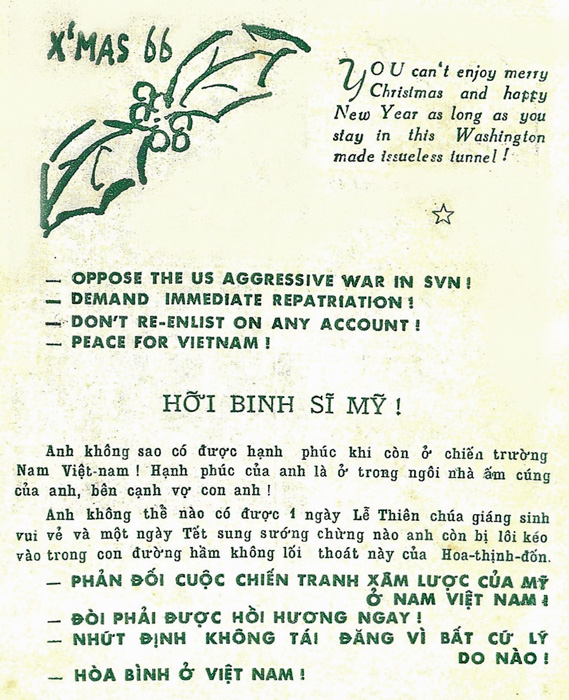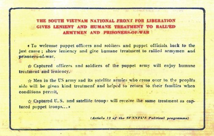 We have illustrated only a sampling of the many National Liberation Front leaflets. The author is always interested in hearing about others that were brought back from Vietnam. Interested readers are encouraged to write to him at sgmbert@hotmail.com.
