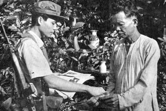 This picture depicts a member of an armed propaganda team or a political organizer proselytizing to South Vietnamese villagers. Most villages in the South had a cell of three communists assigned to watch and oversee village activities. Two of the cell members were generally known by the locals, the third was always secret, even to the two members of the village cell. Thus, the two known cell members reported on the villagers, the third unknown member verified what the two reported, and, in addition, reported on the first two.
