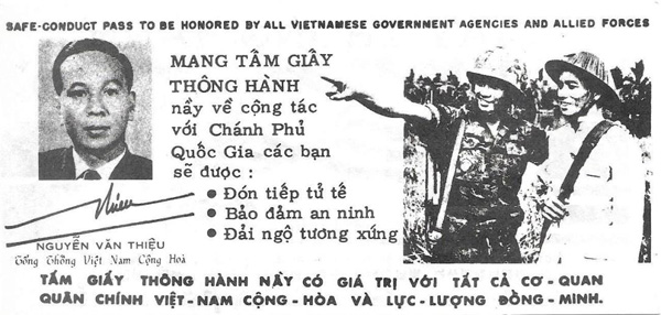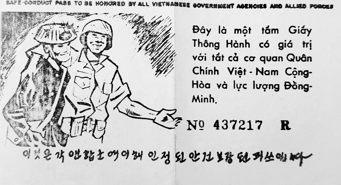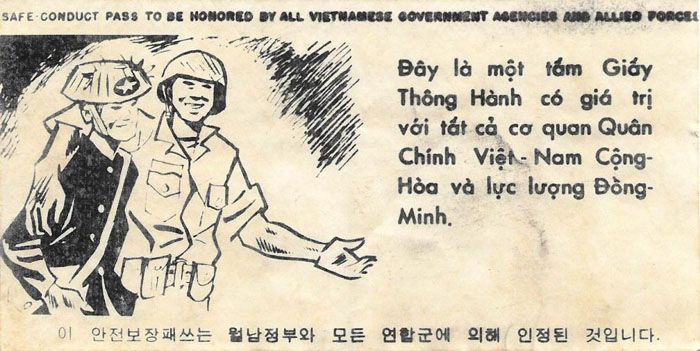 The United States and its allies dropped over 50 billion leaflets on Vietnam. Many of them were safe conduct passes. These passes have been used in every war in recent history and were used in Biblical times, during Medieval times, and even in the American Indian wars. It is very powerful form of propaganda. It allows an enemy to defect with the absolute knowledge that he will be treated fairly and his life and safety are guaranteed.
