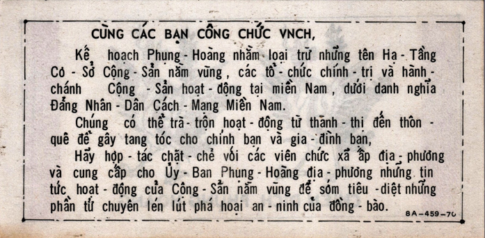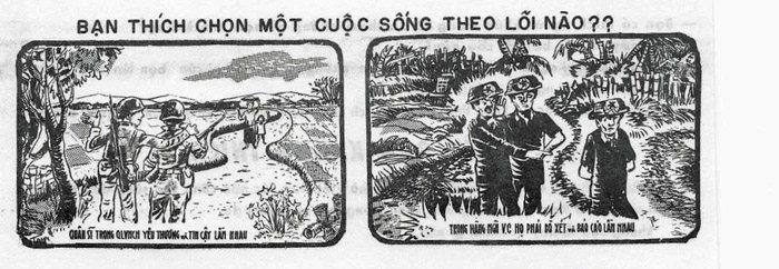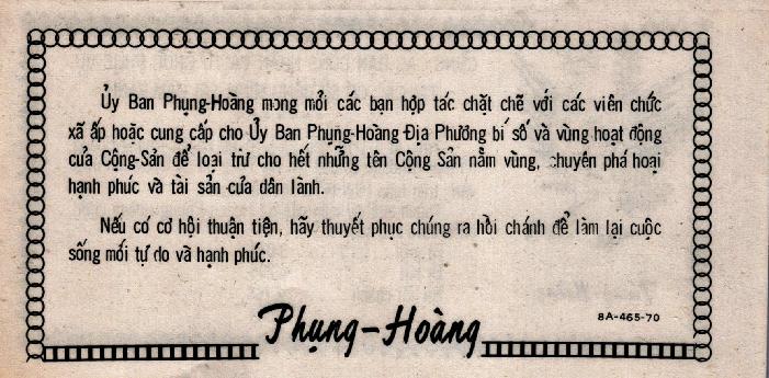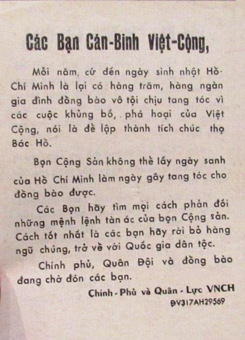 During the cease fire period of Tan Hoi New Year, all United States, Vietnam, and other Allied bases will turn on their searchlight at night. The searchlight will help you to find freedom. Move toward the direction of light, hide your weapon and wait until the daylight to rally. When getting close to the Government of Vietnam or Allied units, shout aloud “CHIEU HOI.” You will be welcomes and receive good treatment. Guide the Government of Vietnam or Allied forces to recover your weapon for a reward.