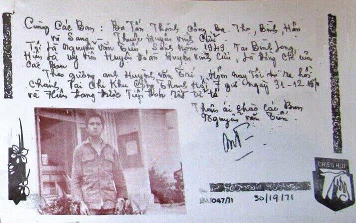 Greetings to my friends Ba Tan, Thank Cong, Ba, Tho Binh, Han and Sang of Vinh Cuu District. I am Nguyen Van Tinh, born in 1949 in Tai Binh Long. I was a commissioner of Vinh Cuu District and a leader of my friends. Following the example of Huynh Van Tri today, I rallied at 0700 hours, 31 December 1970, and I was welcomed and very well treated.