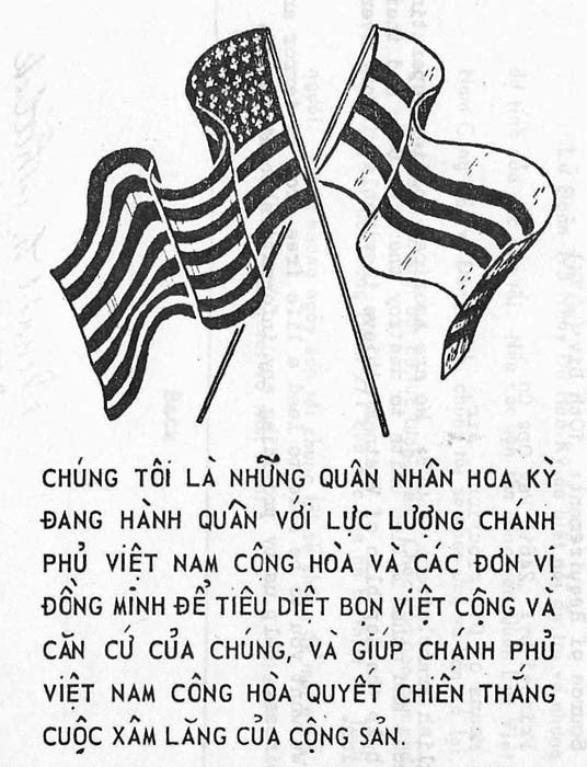 United States Marine Corps forces are operating in your village. When you see a U.S. Marine, do not run away, and attempt to hide. If you are working peacefully in your field or at home, you will not be harmed. If you run away and try to hide, you may be arrested as a suspicious person or be mistaken for a Viet Cong guerrilla and be shot. USMC forces do not want to harm civilians. Follow the rules. Do not run from Marines, do not hide from Marines, obey the curfew regulations, and do not harbor the Viet Cong.