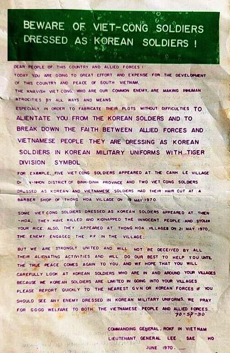 This is a very strange leaflet. At first, I thought it was a Viet Cong black leaflet. The Japanese prepared such a leaflet in WWII insulting the Philippine women. This could be a Viet Cong leaflet telling the Vietnamese not to be fooled by Viet Cong who might be dressed as Korean soldiers. It could cause Vietnamese soldiers to open fire on their allies. The code is also odd. There is a “70” which is surely the year. There is an “SP” which earlier in the war indicated the Joint United States Public Affairs Office “Special Projects” leaflet. The last is “30,” and that would indicate the number of the leaflet in the year 1970 under the SP heading. The message has a green heading on the English language side. The back is in Vietnamese and has a red heading. It is very strange but I will take it at face value and say that it is a legitimate leaflet, probably written by the Vietnamese and perhaps printed by their American allies.