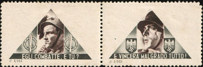 A number of other perforated and gummed but uncoded labels were also produced by the Axis, but it is not known if these were strictly Italian in origin or prepared under the sponsorship of the Germans. One sheet of six labels has three vertical pairs showing famous anti-Allied vignettes by the Italian artist, Gino Boccasile (1901-1952). These same vignettes have been found on leaflets, posters and postcards.