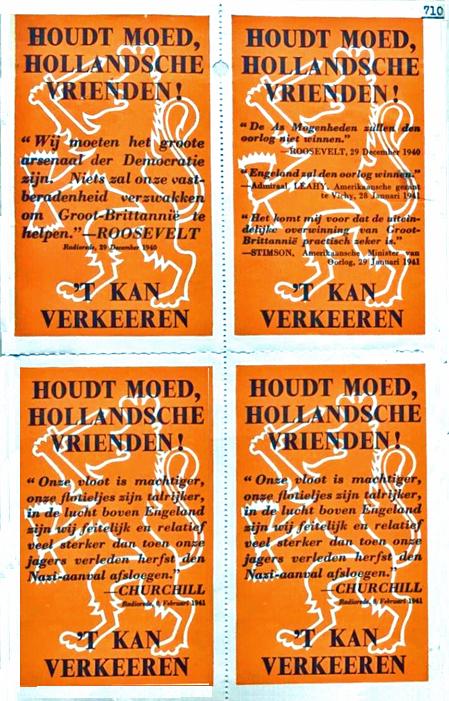 A second group of four leaflets for Belgium was coded EH-B-215a, but, according to the Index, they were not disseminated, perhaps because they were rather wordy. The British might have felt that a more picturesque leaflet with less text was desirable. Each of these four labels was different. Once again, two are in French, two in Flemish. The title at the top reads Courage, amis belges, on les tient! (“Courage Belgian friends, we are coming!”). Roosevelt’s “Arsenal of Democracy” statement is printed on two of the labels, in French and in Flemish, while the other two bear quotes from Roosevelt and Admiral Leahy, also in French and in Flemish.
