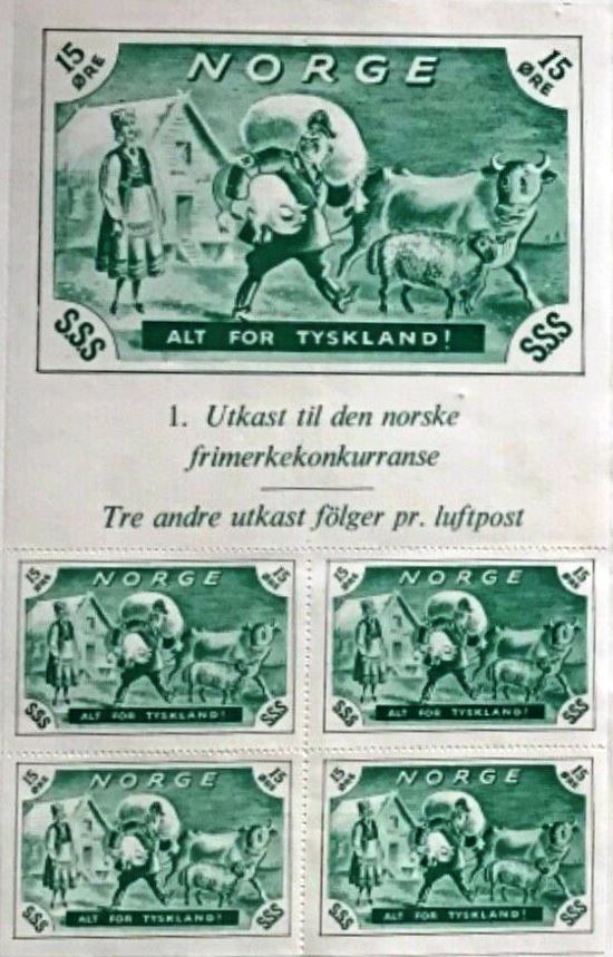 The first label is a 15-ore blue-green, perforated 12 x 10 1/4, with text reading Alt for Tyskland! (“All for Germany!”) and “1st entry for the Norwegian stamp competition – three other entries to follow by airmail. All for GermanyKing Haakon VII’s slogan, “All for Norway.” The vignette depicts a fat Nazi officer confiscating a Norwegian farmer’s livestock. The lower corners of the labels show “S.S.S,” which is an abbreviation for “Death to the pigs,” in Norwegian or "S.S. Swines" in  English. The sheet has the 120 x 76 mm large label at the top and four perforated 60 x 38 mm labels below in the form of a 2 x 2 block.