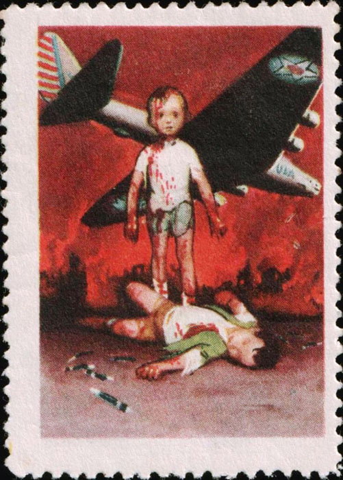 This leaflet shows two young Italian boys. One is covered in blood from injuries received by the bombs from an American B-17 bomber, the other is dead. At the left is the label, at the right the propaganda poster prepared by Mussolini’s Italian Social Republic backed by German troops in Northern Italy.
