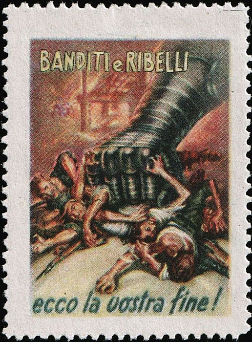 This perforated label shows a giant armored German fist crushing Italian partisans, identified as bandits and rebels. Their homes burn in the background. The German threaten to destroy the Italians that oppose their occupation.