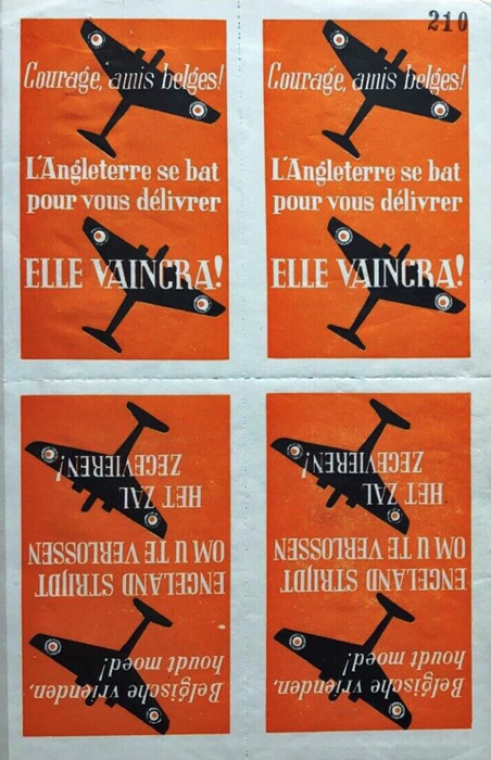Sheets of four labels, each picturing two British bombers, were dropped over Belgium from 4 February to 22 February 1940. The labels are orange with black British bomber silhouettes. Their code is EH-B-210. Although the text on all four labels is identical, it is written in French on two of them, and in Flemish on the other two. The Flemish-language labels are inverted on the sheet. The French text is Courage, amis belges! L’Angleterre se bat pour vous delivrer Elle Vaincra! The Flemish text is Belgische vrienden, houdt moed!Engeland strijdt om u te verlossen het zal zegevieren!” (“Courage Belgian friends! England is fighting to deliver you. SHE WILL WIN!”).