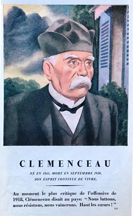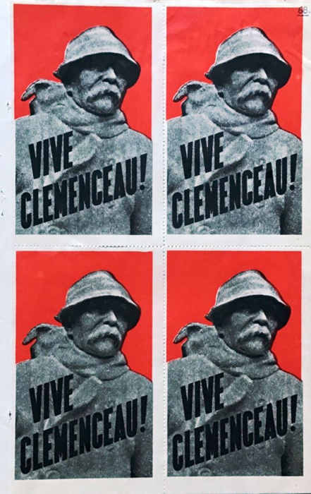 The final group of four leaflets for France was coded EH-F-68 and colored gray, red, and black on white paper. Each label bears the text Vive Clemenceau! (“Long live Clemenceau”) and a photograph of the Georges Clemenceau, French statesman whose determination and courage urged his country on to victory in World War I. The labels were dropped over France from 17 April to 13 May 1941.