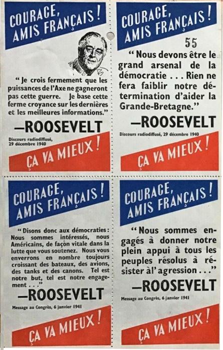 The British prepared a set of four labels for occupied France coded EH-F-55 and colored red, blue, and black on white paper. An attempt has been made to give the impression of the French tricolor flag. These leaflets are similar to the undisseminated Belgian labels, but to these designs the British added color and an illustration to make them brighter and easier to read. The title of all four labels is “Courage amis francais / Ca va mieux! (“Courage French friends / Things will improve!”). The upper left label has a drawing of Roosevelt, the other three are all text. Each bears a different quote from a speech by President Roosevelt. The upper two labels bear a text from his speech of 29 December 1940: