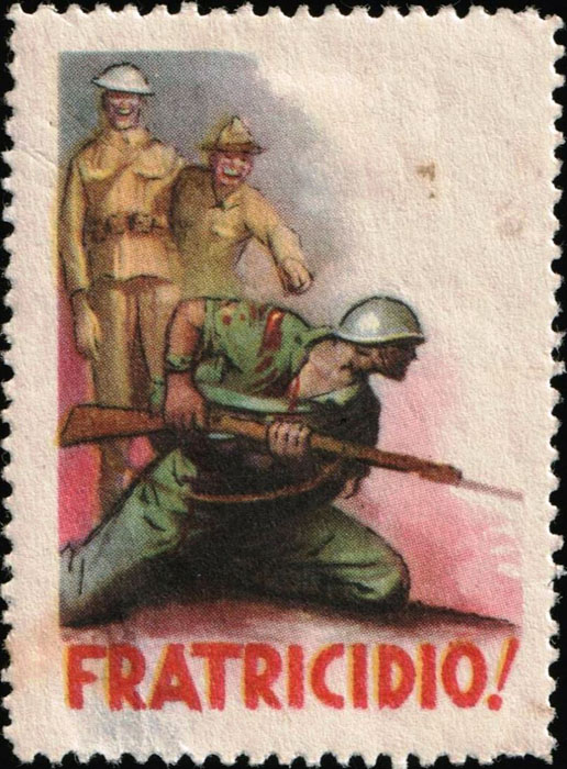 The Italian Social Republic in the North of Italy also prepared this poster depicting an italian soldier attacking a white British soldier and an American black soldier laugh at him in the background for killing his brothers in Italy instead of joining the Fascist movement. We depict both the label and a poster that used the same image.