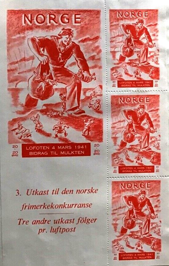 The third Norway label depicts a sailor stuffing little Nazis into his sea bag, with the text reading Lofoten 4 Mars 1941 / bidrag til mulkten (“Lofoten 4 March 1941 / Contribution to the fine”) and “3rd entry for the Norwegian stamp competition – three other entries to follow by airmail. The stamp-like label is a 20+20-ore red-orange, perforated 9 1/2 x 12. The sheet has the large 73 x 117 mm label at the upper left, the three 39 x 63 mm perforated gummed labels to the right in a vertical line.