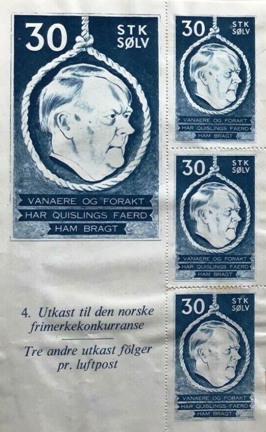 The final label of this series is a 30-stk solv (pieces of silver) blue, perforated 9 1/2 x 12. The text reads Vanaere og forakt har Quislings faerd ham bragt (“Quisling’s conduct has brought him dishonor and contempt”) and “4th entry for the Norwegian stamp competition – three other entries to follow by airmail. The vignette shows Vidkun Quisling, the Norwegian collaborator, head of the puppet government and leader of the Nasjonal Samling (Norwegian Nazi Party), with a hangman’s noose around his head. The sheet has the large 72 x 102 mm label at the upper left and the three 41 x 64 mm labels in a vertical line at the right. This message proved prophetic. At the end of the war, Quisling was tried for high treason and was executed on 24 November 1945.
