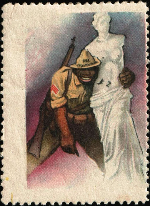 The Italian artist Gino Boccasile painted the vignette of Venus de Milo with the black American soldier. It was also prepared as a perforated label, a propaganda postcard and a poster. The concept of course is to show that Americans have so little regard for culture and art that they see the priceless statues as a souvenir worth about two dollars. And of course, to drive the point home, the American is depicted as a black soldier, a race the Germans felt racially far superior to. In case you had any doubt of where the soldier came from, they placed "USA" on his head cover.