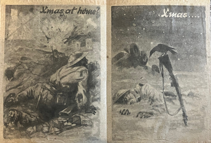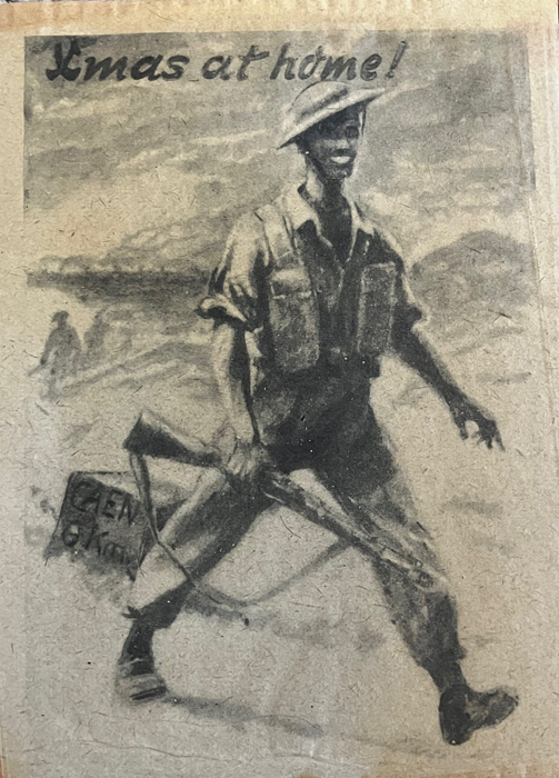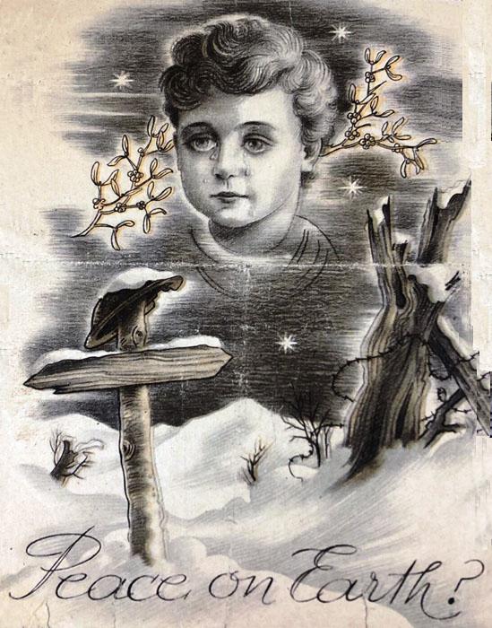 The Germans made great use of the Christmas motif in their propaganda, but few were actually in the form of a Christmas card. All we know about one card is the text. On the front it says "Hello there!" Text on the inside says, "We thought you would be home for Christmas.  Well boys – take it easy – you've been promised so many things. It's not your first and certainly not your last disappointment. Cheer up – console yourself with Jerry. He wishes you a very merry Christmas and the best of luck in the new year."