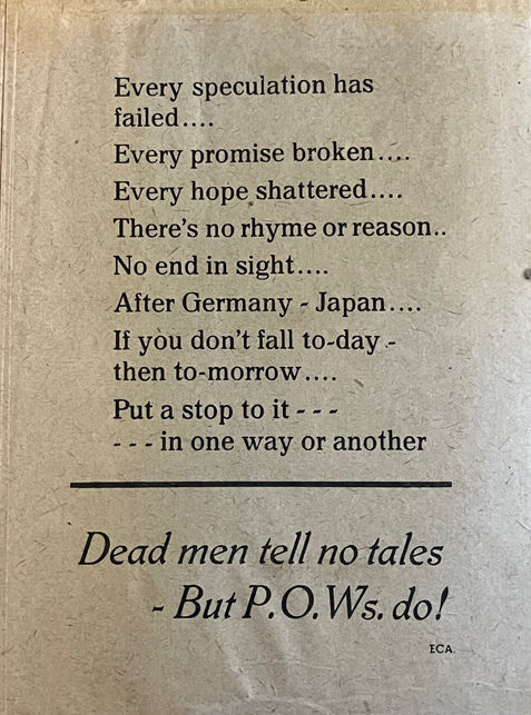 Notice the discoloration on this leaflet. Because it was used in the Philippines it was probably produced by General MacArthur’s Psychological Warfare Branch. It does not bear a code number (usually a numerical with the letter “J”) because I suspect it was meant as a religious and not a political message. The PWB members often kept souvenir books with the leaflets they printed. This one appears to have been glued down and then soaked in water to remove it from the page. I believe the stains are old glue marks.